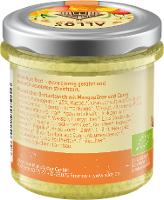 Mangopüree* (25%), Rapsöl*, Orangensaft ausOrangensaftkonzentrat*, Sonnenblumenkerne*,Wasser, Zitronensaft aus Zitronensaftkonzentrat*,Agavendicksaft*, Kokosmilch* (Kokosnussfleisch*, Wasser), Currypulver*(1,5%) (Koriander*, Kurkuma*, Fenchel*, Bockshornklee*,Kümmel*, Ingwer*, Zwiebel*, Paprika*,Knoblauch*, Zimt*, Chili*), Meersalz, Obstessig*,Eiweißpulver aus Sonnenblumenkernen*,Tapiokastärke*,weißer Pfeffer*, Chilipulver*.
