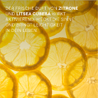 Erwecke und erfrische deine Sinne mit dem aktivierenden, 100% natürlichen Duft von Zitrone und Litsea Cubeba. Erlebe ein Gefühl von Leichtigkeit und genieße den belebenden Aufschwung.