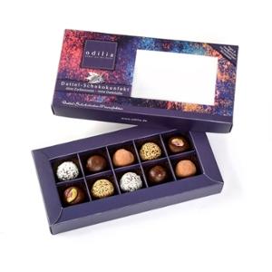 2 Dattel-Schokokonfekte von jeder Sorte: Pistazie, Kokos, Haselnuss, Sesam und Kakao.