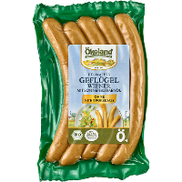 Die Ökoland Geflügel Wiener werden aus  bestem Bio Puten- und Hähnchenfleisch hergestellt und in Delikatess Qualität angeboten. Dank einer ausgefeilten Rezeptur unter Verwendung von Sonnenblumenöl und einem hohen Fleischanteil schmecken sie so ausgezeichnet - zu Salaten, im Eintopf oder klassisch mit Senf im Brötchen.