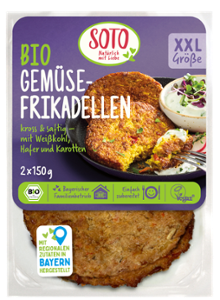 Unsere SOTO Gemüsefrikadellen im XXL-Format kombinieren frischen Weißkohl, rote Paprika, Karotten und nussige Haferflocken - außen schön kross, innen herrlich saftig. Das Besondere: Die meisten der Zutaten stammen von Bio-Landwirten aus Bayern - kurze Wege, echte Regionalität. Ob zu Salat, Kartoffelpüree oder mit Dip: ein Genuss für jeden Anlass!