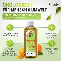 Bei der Verarbeitung von Zitrusfrüchten wird nur das Fruchtfleisch genutzt, die Schalen werden meist ungebraucht entsorgt - dabei lässt sich gerade aus ihnen viel Nützliches herstellen. Zum Beispiel der AlmaWin Orangenöl Reiniger! In den Schalen ist Orangenterpene enthalten, ein rein natürliches Lösemittel, das pur oder verdünnt angewendet werden kann. Der Orangenöl Reiniger löst beispielsweise Klebereste, Wachs oder Kaugummi und aller Art hartnäckige Flecken im Haushalt.Das Konzentrat ist extrem sparsam im Verbrauch und verbreitet einen herrlich frischen Orangenduft.Der AlmaWin Orangenöl Reiniger ist vegan, durch Ecogarantie ökozertifiziert und wurde erfolgreich dermatologisch getestet. Die Flasche besteht zu 100 % aus Recycling-PET.