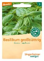 Typ Genoveser. Große, dunkelgrüne, gewölbte Blätter mit ausgeprägt starkem Aroma und kräftigem Wuchs. Basilikum ist wärmebedürftig, liebt volle Sonne und einen windgeschützten Platz, auch für Balkonkästen und Töpfe. Nicht übermäßig gießen aber auch nie austrocknen lassen. Aussaat nur dünn mit Erde bedecken, bis zur Keimung feucht halten."TIPP":  Bei der Ernte nicht einzelne Blätter, sondern Triebspitzen schneiden. Die Pflanze verzweigt sich dann stärker und bildet mehr Blattmasse. Gute Basis für Pesto Genovese.