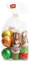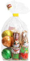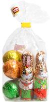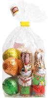 Osterhasen und bunte Ostereier in kindgerecht gestaltetem Stanniolpapier verpackt.