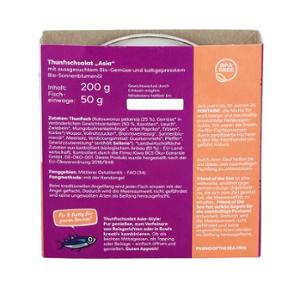 THUNFISCH (Katsuwonus pelamis)25%, Gemüse* (50%) - Karotten*, Lauch*, Zwiebeln*,Mungobohnenkeimlinge*, roter Paprika*,Erbsen*, Kürbis* in veränderlichen Gewichtsanteilen- Wasser, Vollrohrzucker*, Branntweinessig*,Sonnenblumenöl*, Meersalz, VerdickungsmittelGuarkernmehl* und Johannisbrotkernmehl*,Pfeffer*, Gewürzzubereitung* (enthält SELLERIE*).