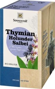 Kräuterteemischung mit Thymian, Holunder, SalbeiGeschmack: ätherisch, krautig, blumig