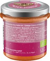 Tomaten* (21%), Sonnenblumenöl*, Wasser, Tomatenmark* (9%), Rote Bete-Saft aus Rote Bete-Saftkonzentrat*, Sonnenblumenkerne*, getrocknete Tomaten* (5%) (Tomaten*, Salz), Agavendicksaft*, MOZZARELLA* (5%) (KUHMILCH*, Salz, mikrobielles Lab, Säuerungsmittel: Citronensäure), Zwiebeln*, Basilikum*, HARTKÄSE* (2%) (KUHMILCH*, Salz, Käsereikulturen, mikrobielles Lab), Kartoffelstärke*, Balsamessig* (Weißweinessig*, Traubenmostkonzentrat*), Knoblauchpulver*, Säuerungsmittel: Milchsäure, Meersalz, schwarzer Pfeffer*, Oregano*.