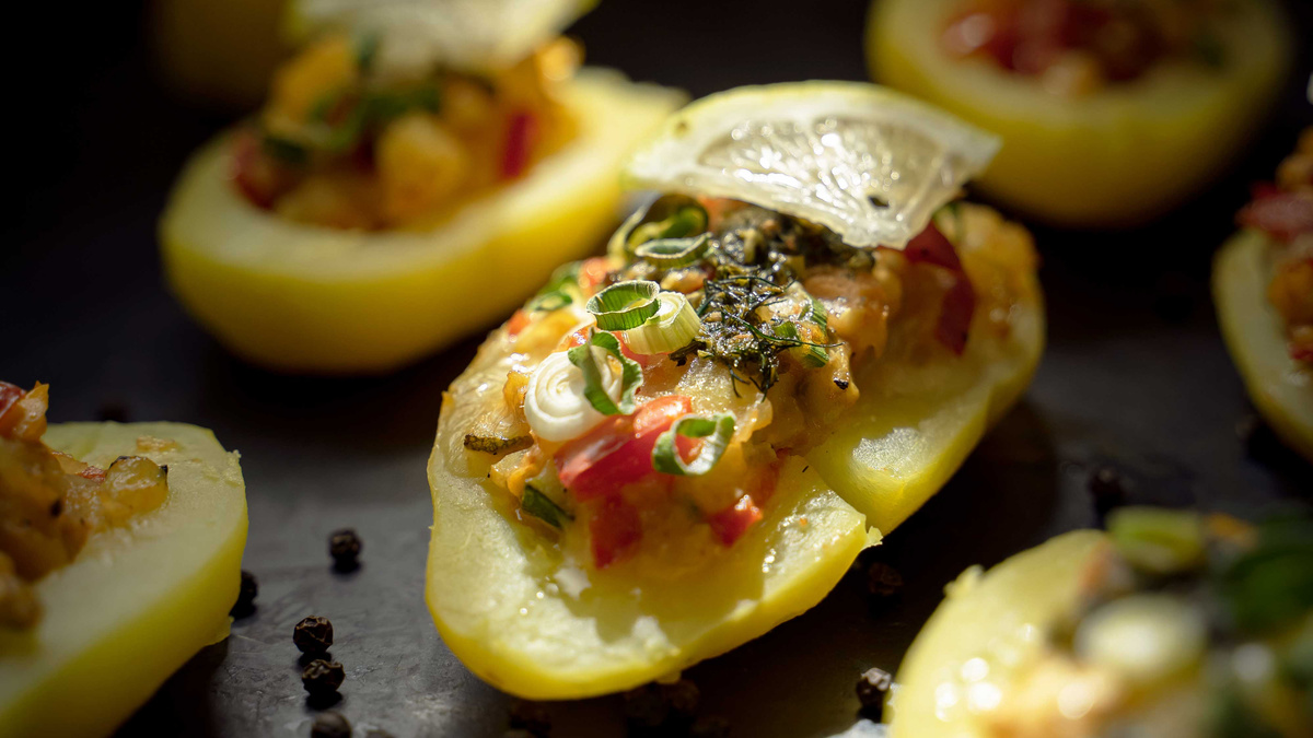 Die gegarten Kartoffeln abkühlen lassen, anschließend halbieren und aushöhlen. Diese Kartoffelmasse mit der Gemüsemischung vermengen und die Mischung in die ausgehöhlten Kartoffelhälften füllen. Fertig gefüllte Kartoffeln in die Auflaufform setzen.
