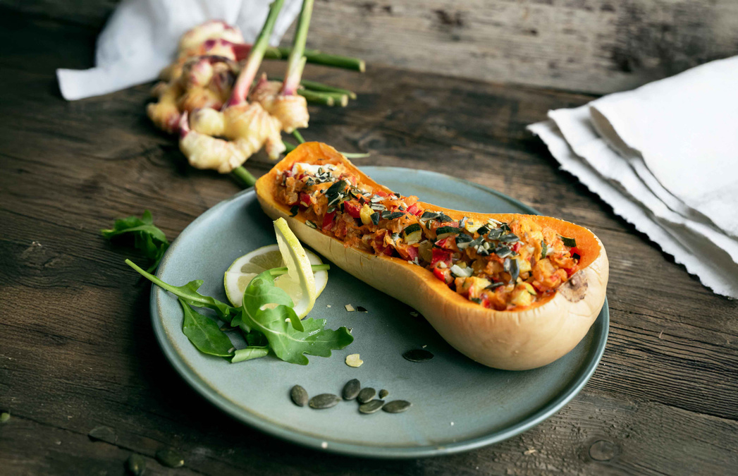 Die gebackenen Butternuthälften aus dem Ofen holen, Kürbis-Zucchini-Tomatengemüse einfüllen und mit einem Löffel Ziegenfrischkäse-Flecken draufsetzen. Mit gehackten Kürbiskernen bestreuen. Im Ofen weitere 10 Minuten überbacken. Zum Anrichten mit Kürbiskernöl beträufeln und mit geschnittenem Basilikum bestreuen.