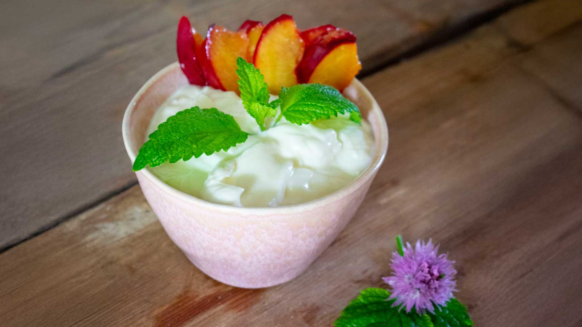 Wer möchte, toppt mit einigen Blättern Minze oder Zitronenmelisse.