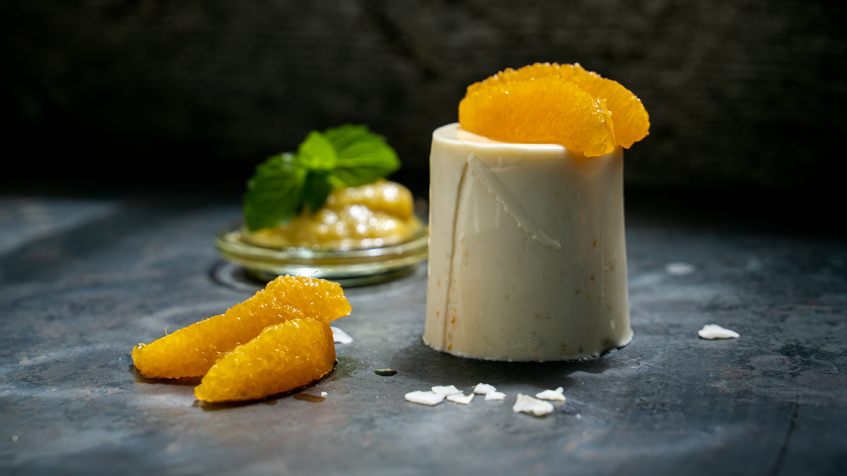 Orange heiß abwaschen, abtrocknen, die Schale abreiben und den Saft auspressen. Kokosmilch, Sahne, 4 EL Rohrzucker und Orangenabrieb in einen Topf geben und gut durchrühren. Bei milder Hitze ca. 2 Minuten köcheln.