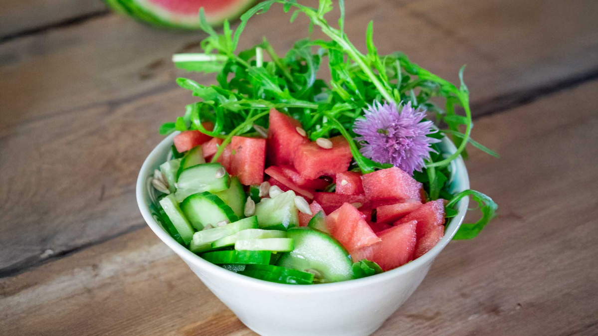 Zum Anrichten: Rucola auf 4 Salatteller verteilen, Wassermelonen-Gurken in die Mitte setzen (und mit Fetabröseln) und Sonnenblumenkernen toppen.